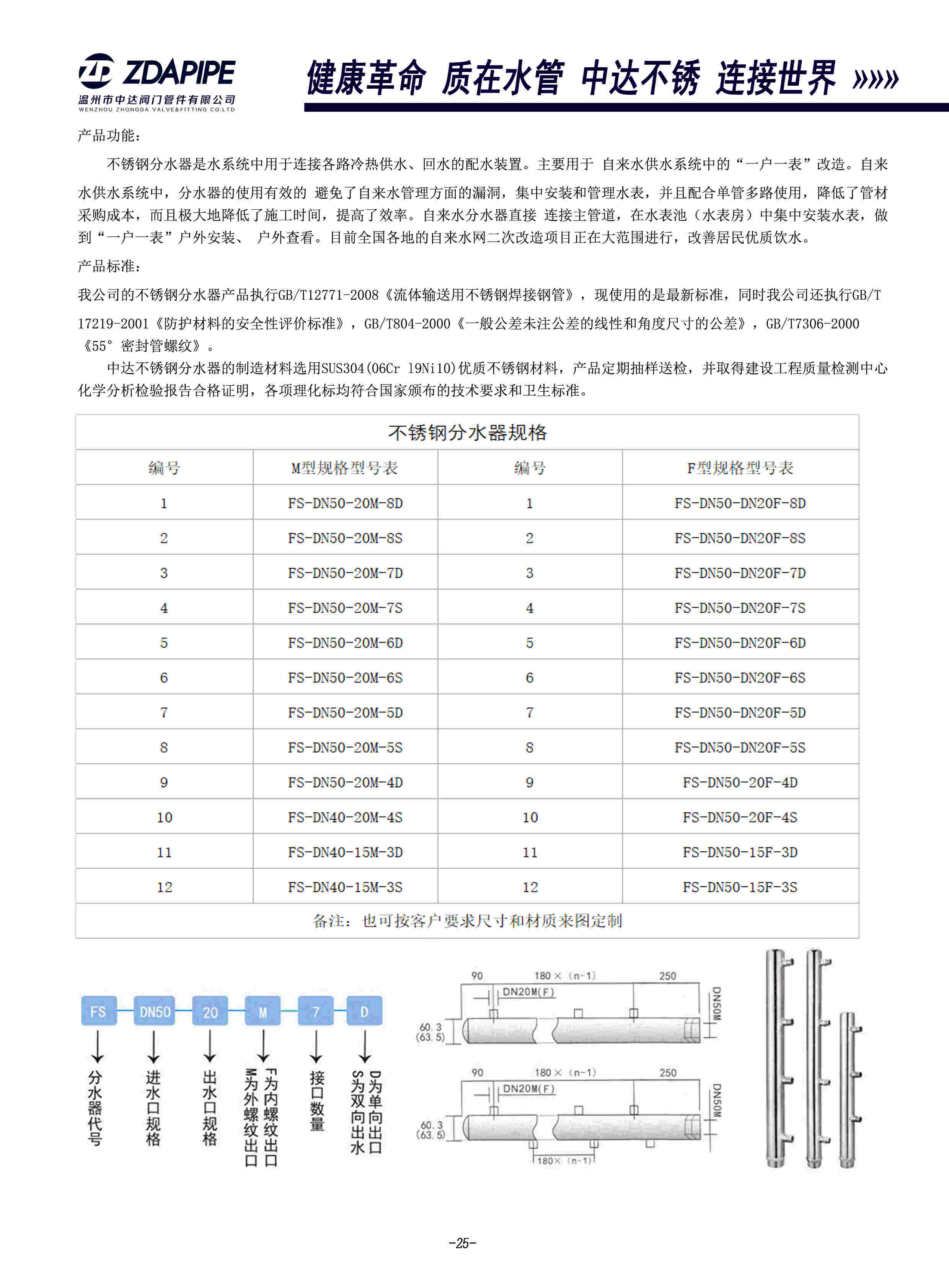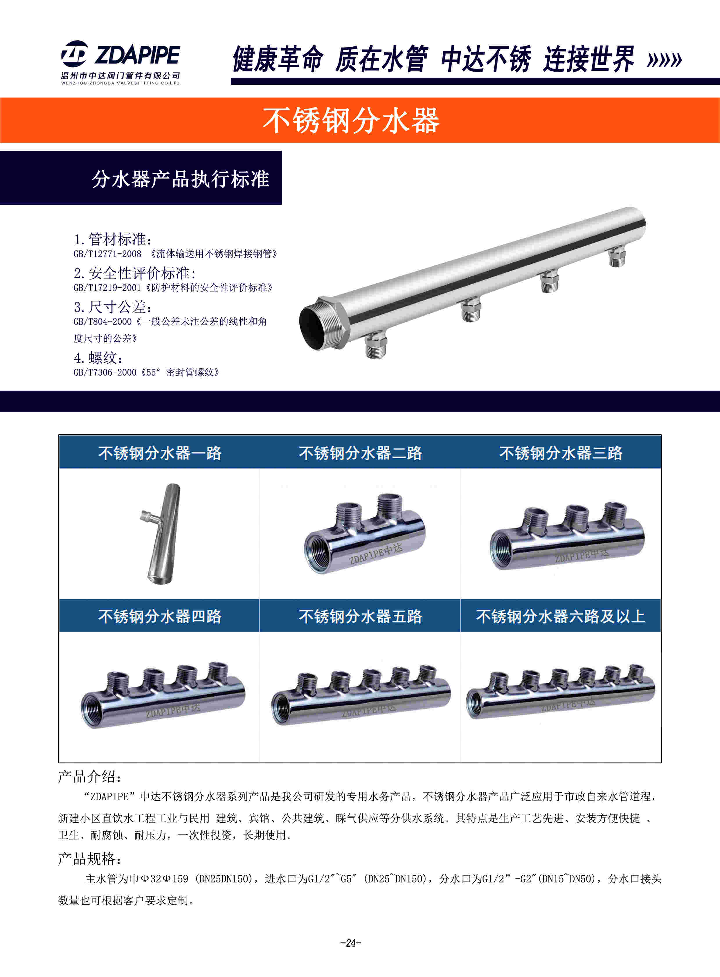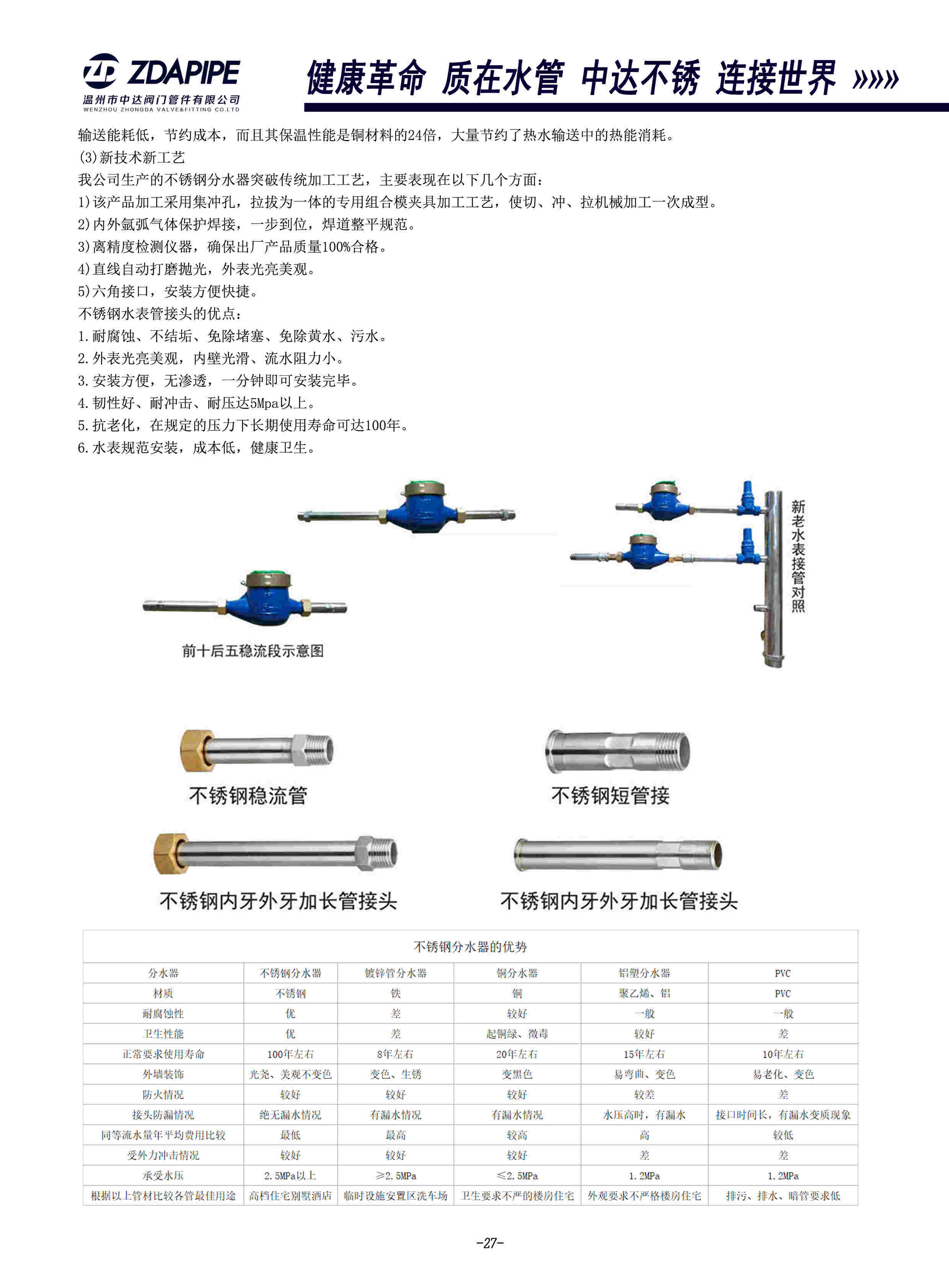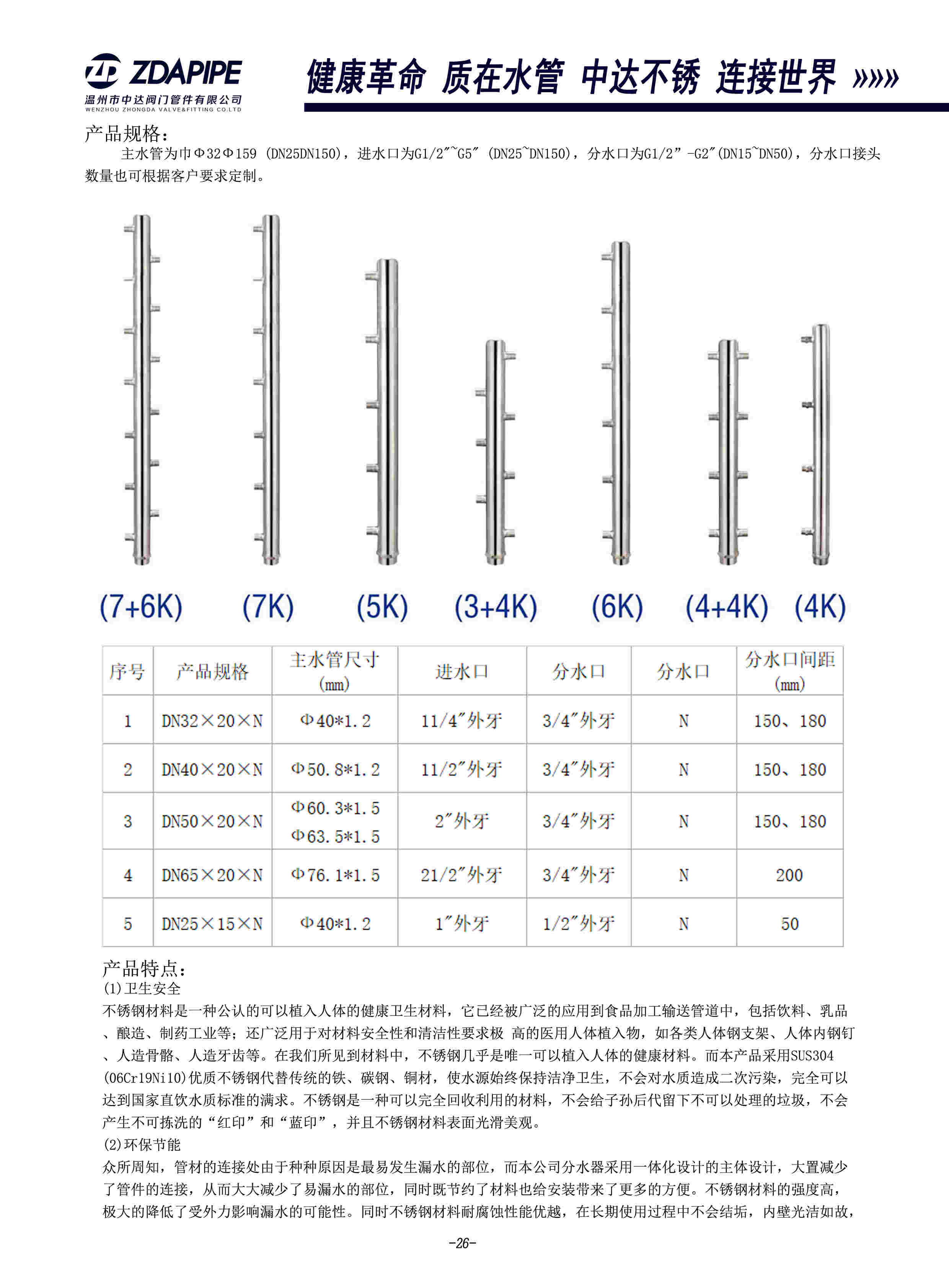 - 用途范圍:分水器產(chǎn)品廣泛應(yīng)用于市政自來(lái)水管道程,新建小區(qū)直飲水工程工業(yè)與民用 建筑、賓館、公共建筑、睬氣供應(yīng)等分供水系統(tǒng)。其特點(diǎn)是生產(chǎn)工藝先進(jìn)、安裝方便快捷 、衛(wèi)生、耐腐蝕、耐壓力,一次性投資,長(zhǎng)期使用。給水,排水,二次供水,水務(wù)工程,自來(lái)水公司,醫(yī)院,學(xué)校,酒店,賓館,天然氣工程,自來(lái)水工程,直飲水工程,家裝水管工程,工業(yè)管道工程,水處理工程,清潔能源工程,綠色能源,健康革命,質(zhì)在水管,中達(dá)不銹,連接世界。